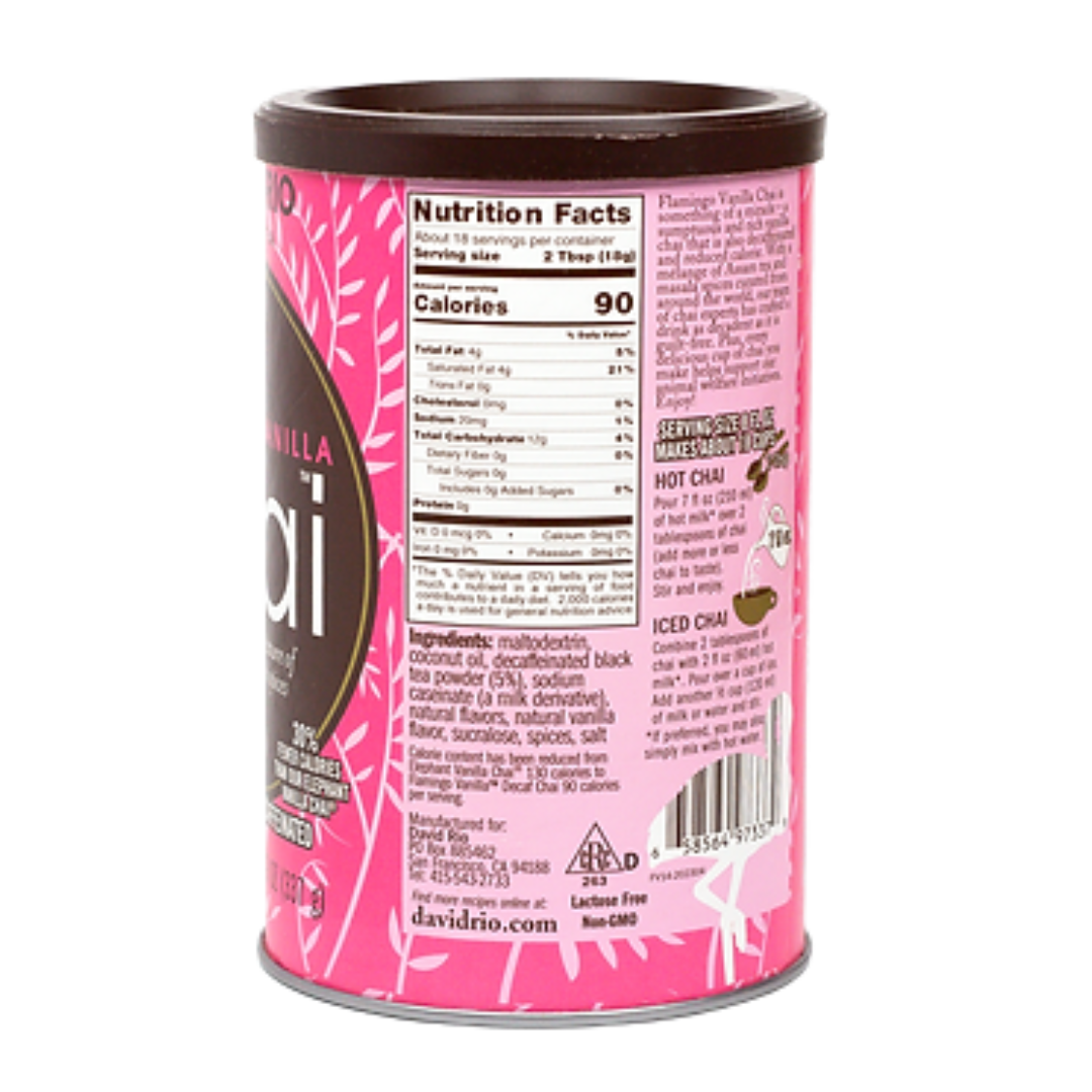 Flamingo Vanilla Decaf, een Chai gebasseerd op de Elephant vanille smaak. Low calorie en gezoet met sucralose, de ideale vervanger voor suiker.